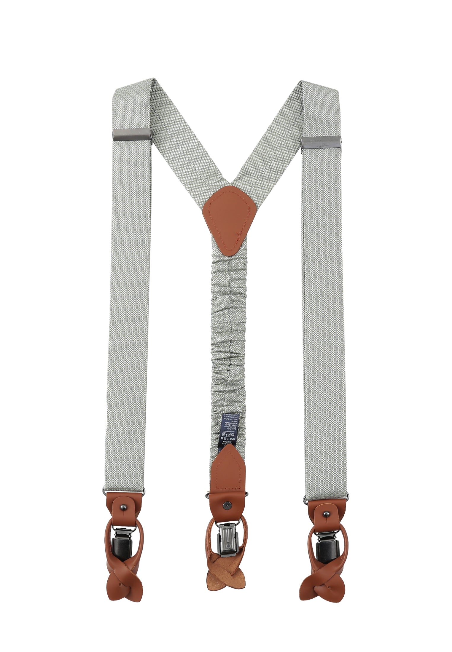 • Für Jeans/robuste Hosen: Metall-Clips; für Anzughosen: Knopf-Variante mit Lederschlaufen.